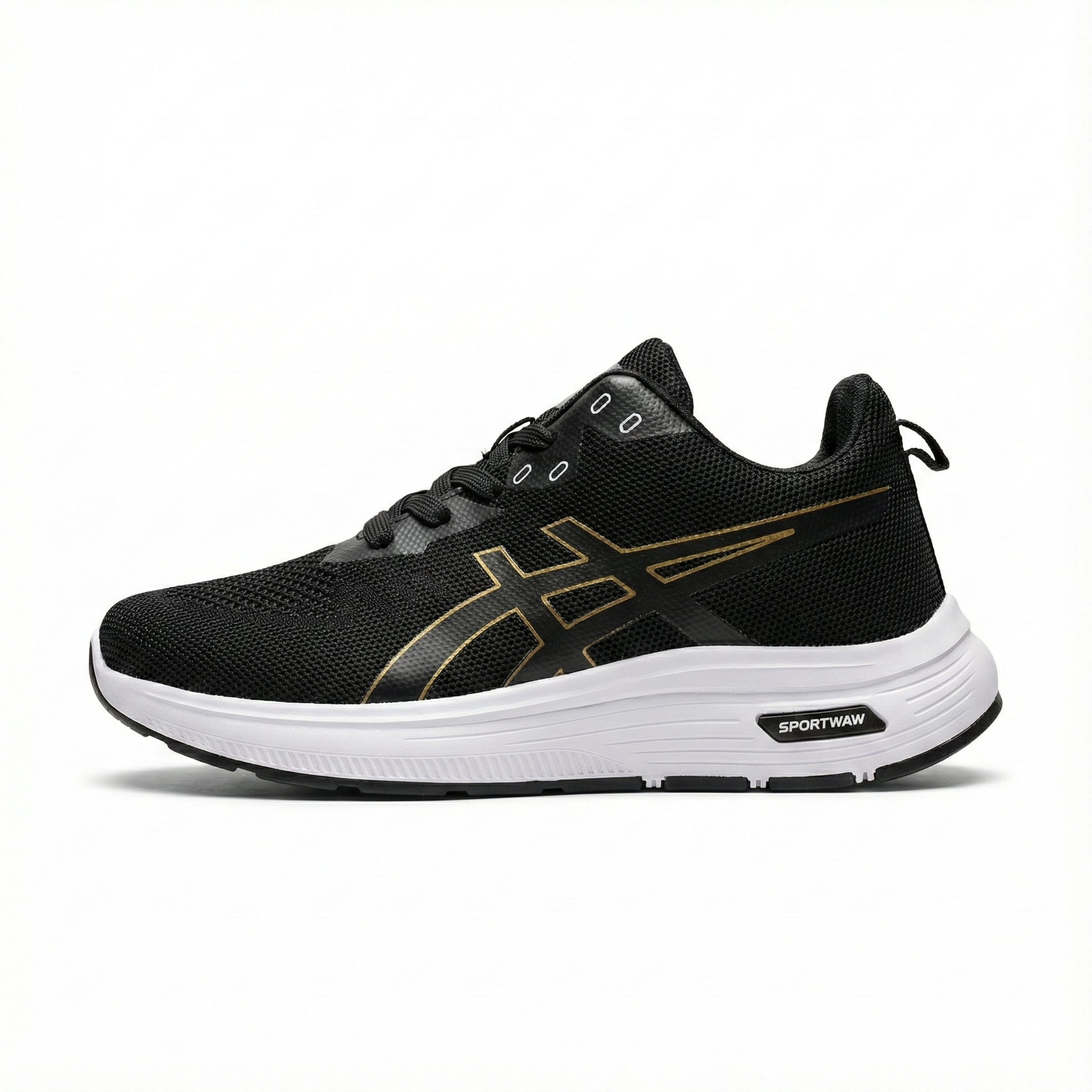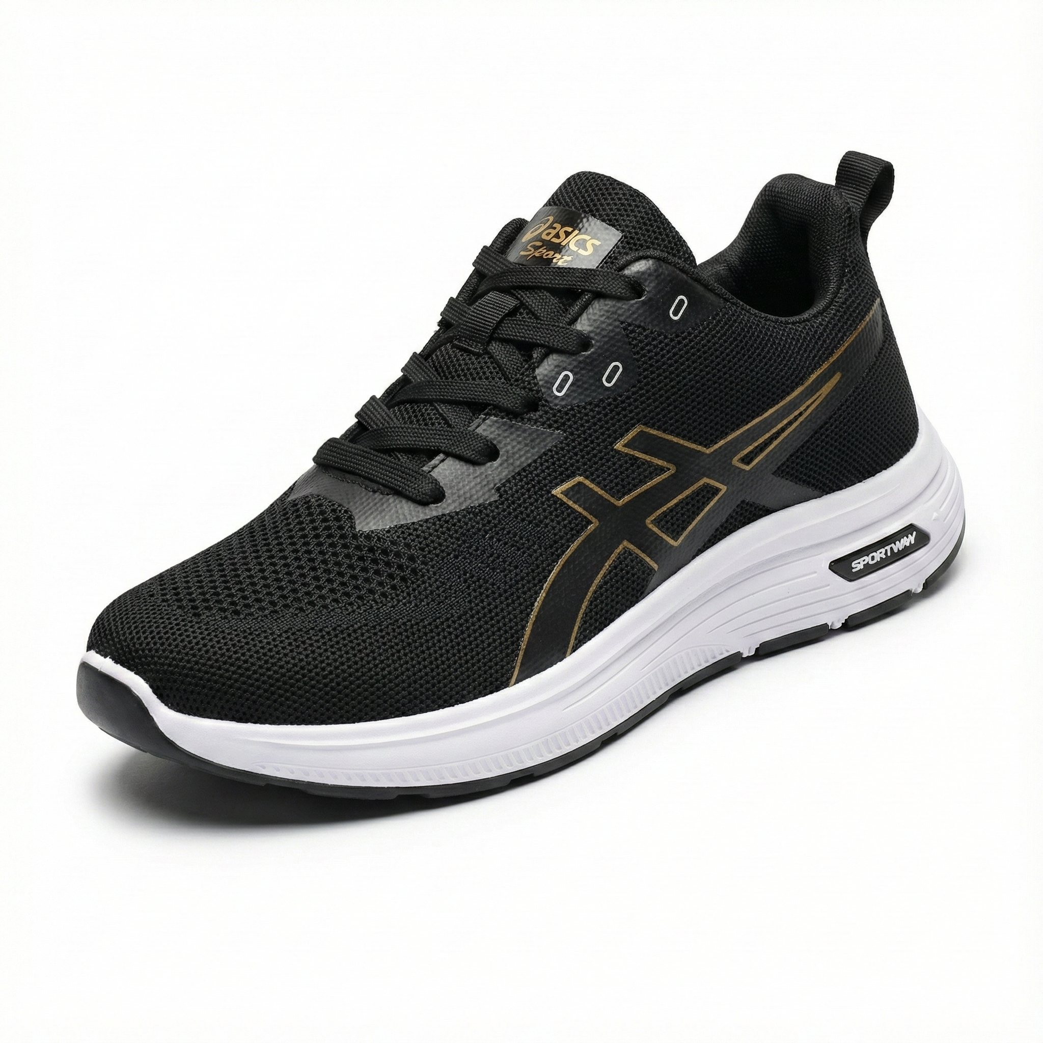 AsicsX is designed for everyday comfort with a clean, sporty edge. The breathable mesh upper keeps your feet cool, while the cushioned midsole delivers a smooth, lightweight feel with every step. Its stable outsole provides reliable grip, making it perfect for daily wear, light workouts, and long hours on your feet. Finished with a sleek black-and-gold look, AsicsX blends performance, durability, and modern style effortlessly.