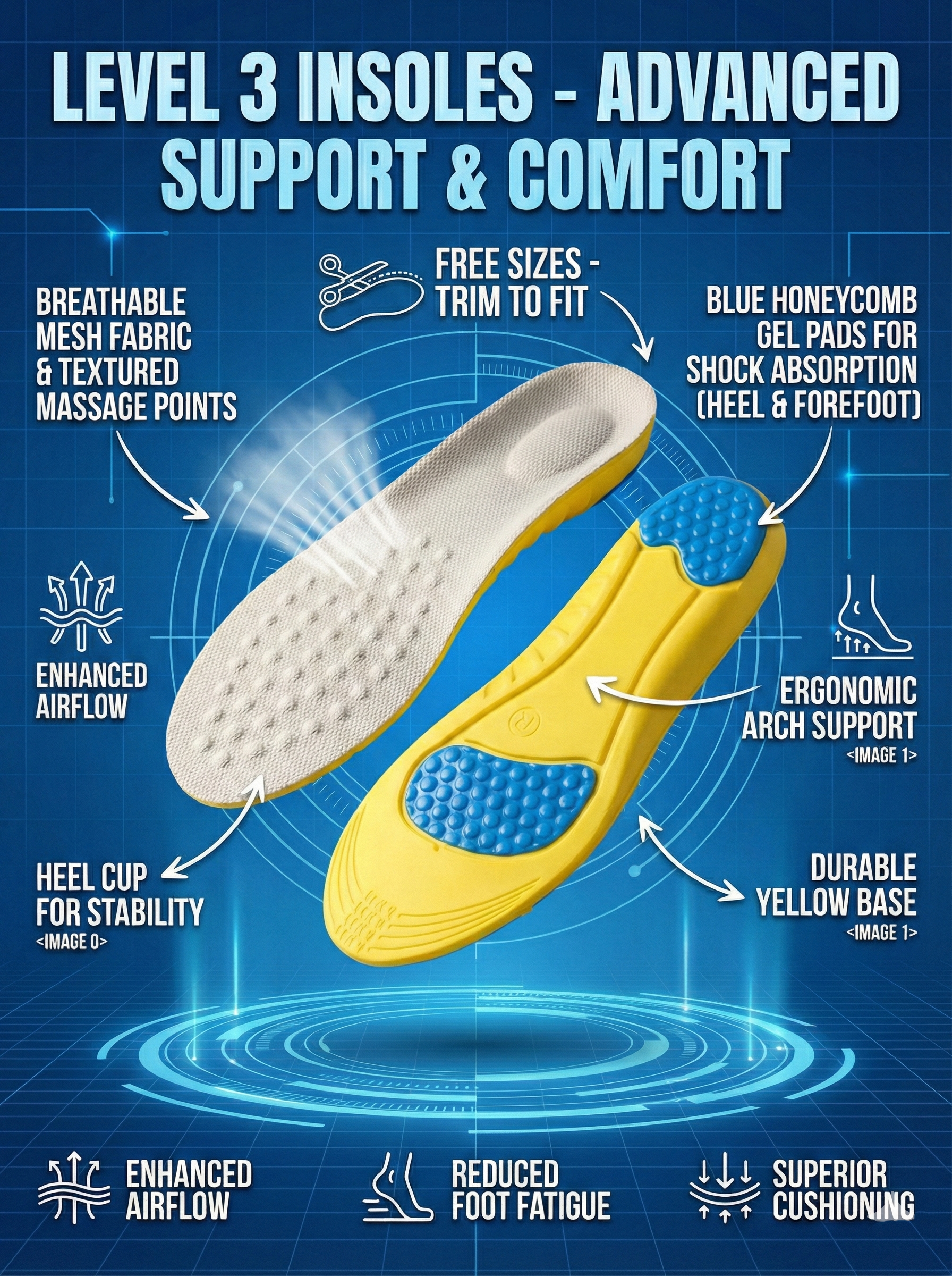 Upgrade your comfort with our Level 3 Advanced Support Insoles — engineered for maximum cushioning, stability, and all-day performance.