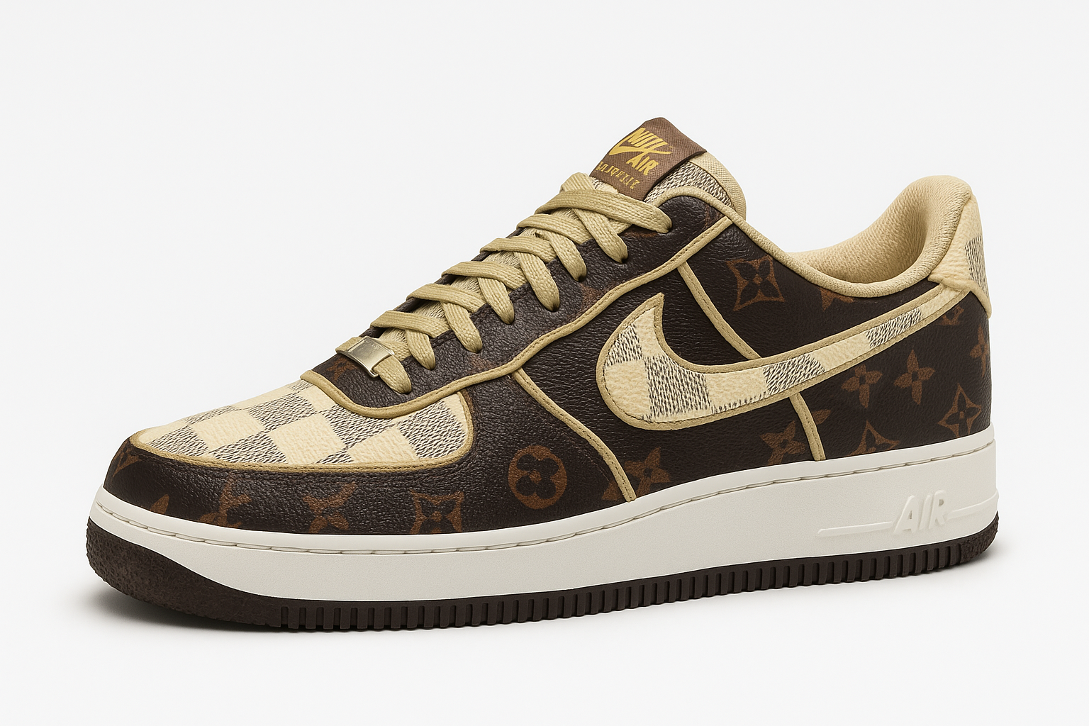 The upper features a rich, chocolate brown faux leather base, intricately adorned with monogrammed floral motifs and checkerboard textures, creating a bold visual statement. A textured beige Swoosh overlays the lateral panel, echoing vintage luxury with modern finesse. The crisp white midsole provides a clean contrast, elevating the entire look with timeless appeal.